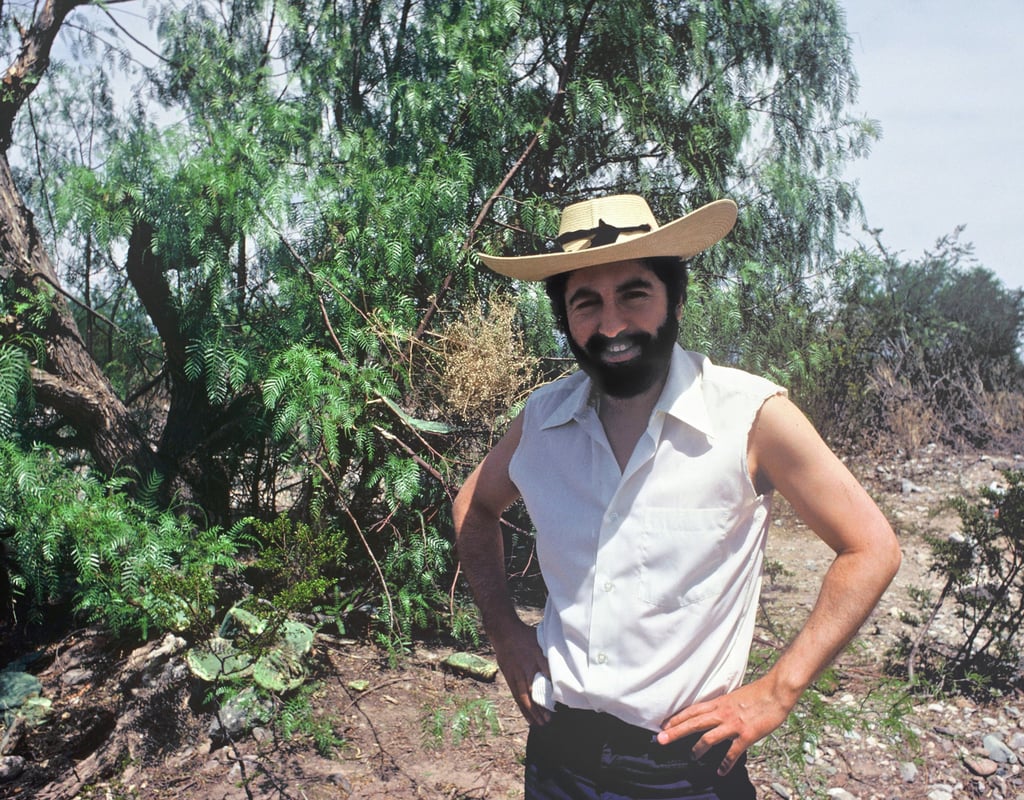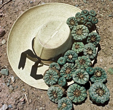 4 Cabezas de péyotl sobre el sombrero del documentalista y escritor Manuel Peñafiel