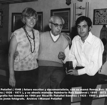 A causa de su arduo trabajo y neurosis, mi padre Ricardo permaneció ausente en mi vida; me pregunto que hubiera sido de mí, sin aquella sólida figura masculina que representó mi abuelo materno Humberto Ruiz Sandoval ( 1894 - 1973 ) durante mi introvertida infancia, y juventud sin brújula. Mis tempranos años transcurrieron en íntimo enlace con mi madre Renée Ruiz Sandoval ( 1926 - 1971 ) y mi abuela materna Josefina Pesquera ( 1907 - 1996 ); sin hombres a quien imitar en casa, tal vez yo hubiera aprendido a bordar, o mi virilidad se hubiera escurrido fuera de mí hacia narcisista espejo. Sin embargo, aquel gigante de nívea melena, me reconfortó entre sus brazos durante la primeriza angustiosa incertidumbre existencial; sensible y solitaria infancia amedrentada por amenazas infernales del catecismo católico impartido en el Colegio del Tepeyac, donde crueles frailes y monjas nos azotaban por la menor falta cometida.